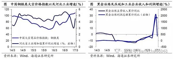 自16年下半年以来,钢铁价格持续上涨,为河北省经济增长带来了推动力量。商务部公布的中国价格指数(钢铁类),从16年6月的70.2一路上升至17年3月的108.6。在钢价上涨带动钢企盈利改善,令生产明显扩张。17年1季度黑色金属冶炼和压延加增长186.3%,黑色金属冶炼及压延加工业企业的利润总额增速更是高达358.9%。钢铁相关产业生产、经营状况改善也带动河北省工业增速反弹,从16年12月的-6.2%大幅回升转正至17年3月的5.2%.