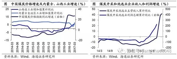 在经历了持续4年的负增长后,17年煤炭开采洗选业收入增速大幅回升转正,1季度同比增长41.7%,而利润增速则在16年8月转正,16年增速高达223.6%。而作为煤炭大省,内蒙古和山西工业增速也持续回升,山西从16年4月的-4.2%一路飙升至17年3月的7.0%,内蒙古则升至9.4%。一季度山西、内蒙古工业增速分别为5.8%和7.6%,均较16年底显著回升。