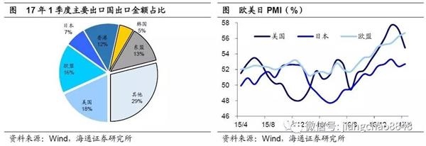 一季度外需整体改善。从外部环境来看,一季度主要出口地区美国、日本、韩国、欧盟、东盟出口占比分别为18%、7%、5%、16%和13%,16年下半年以来外部环境整体复苏,美、欧、日等发达经济体制造业加速上行,均创近年新高,从而有力地带动外需。欧美的消费也在回暖,美国零售销售额季调同比17年以来一直在5%以上,较之前大幅改善,而欧元区的零售指数同比也于16年下半年止跌回升。