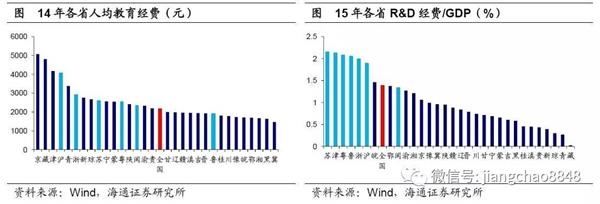 工业由投资驱动,而服务业由人力资本与创新驱动。东部沿海各省人均教育经费高于全国水平,企业研发投入占GDP比重明显高于全国平均水平,江苏、广东、山东、浙江、上海、天津占比都超过1.5%。教育与科研投入为东部沿海产业升级提供了人力与技术上的支持,科技创新与产业升级为其经济增长提供新动能。