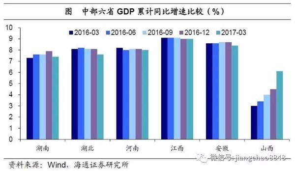 一季度中部六省经济增速普遍回落。除山西外,各省17年一季度GDP增速均较16年下滑。与去年同期相比,其余五省中,仅湖南小幅上升0.1%,湖北、河北、江西、安徽GDP增速均低于去年同期。