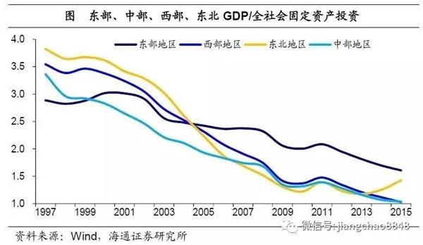 中西部投资投入产出比偏低。虽然中部地区投资增速高企,但经济增速却整体低迷、普遍下滑。其根源在于投资的投入产出比偏低。过去20年,中国各区域投资投入产出比(GDP/全社会固定资产投资)均出现不同程度的下滑——东部地区投入产出比下滑速度较慢,05年以来持续领跑;东北地区在经历了大幅下滑后触底反弹,14、15年均呈回升态势;而中、西部地区却是持续滑落,15年底分别为1.04和1.03。这意味着中、西部地区依靠投资驱动经济的老路,已渐入尾声。
