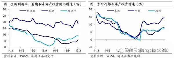 中部地产投资增速远超东、西部。全国固定资产投资增速自去年下半年以来持续回升,其中制造业投资和地产投资双双走强。而地产投资同样是中部地区投资增速高企的原因。比较东中西部地产投资增速,在16年后出现明显分化,17年1季度中部地区地产投资增速高达14.7%,而东、西部分别为7.9%和7.5%.