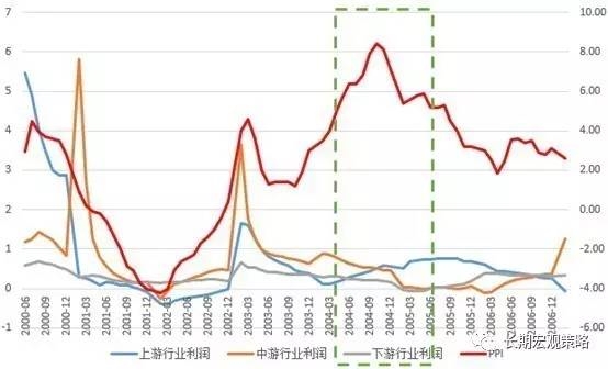 2004至2005年期间,我国也曾出现利润增速集中于上游的情形发生,上游行业利润增速由2004年3月11.16%,连续回升至2005年5月的72.41%;然而同期中游与下游行业利润却出现连续下降,中游行业利润增速由84.83%降至3.69%,下游行业利润增速由30.36%降至-4.85%(出现亏损)。可以看到,此阶段的PPI上升过程由受到负向循环的作用,结束上升,见顶后快速回落。
