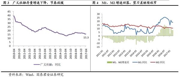 2、广义社融继续回落,节奏放缓(15.3%,前值15.5%),主因地方政府债务置换放缓,去年债务置换规模近6万亿,今年定的目标是3万亿,1-4月份看今年置换不足8000亿,较去年同期1.9万亿明显回落,后期这一影响将持续,同时金融去杠杆大背景也将影响广义社融回落。