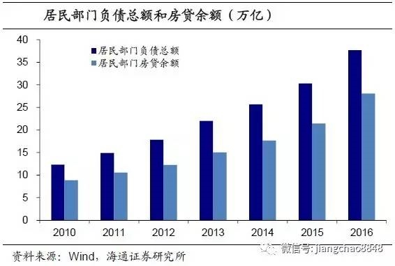 17年我国居民部门杠杆率取决于地产销售和房贷发放情况。2010到2015年间,居民部门房贷每年的增幅基本在20%左右,但随着房地产市场的火爆,2016年居民房贷余额大涨30%。