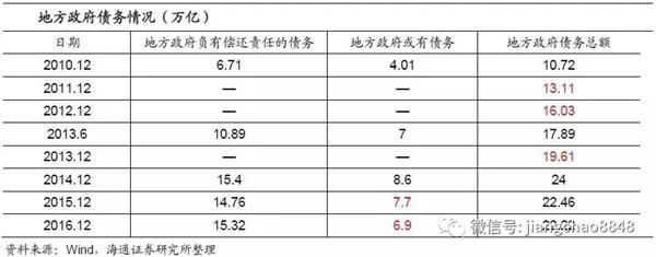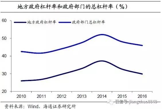 而2015年新预算法实施后,我国开始对地方政府债务规模进行限额管理,根据财政部公布的数据,2015和2016年地方政府负有偿还责任的债务为14.76万亿和15.32万亿。而根据十二届全国人大常委会第十六次会议议案和财政部相关发言人的数据,可推断得到2015年和2016年地方政府的或有债务为7.7万亿和6.9万亿。因此可计算出2016年地方政府的债务总额为22万亿,杠杆率为30%,政府部门的总杠杆率则为46%。