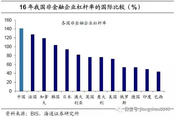 政府居民杠杆低、非金融企业杠杆高。16年我国政府和居民部门的杠杆率之和为96.6%,仅高于印度和俄罗斯,低于大部分国家。但非金融企业的杠杆率高达141%,在所选取的13个主要国家中排名第一,非金融企业杠杆率明显偏高。