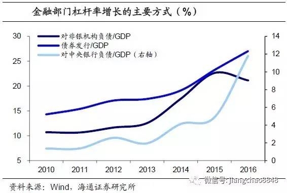 具体看各部分的负债率可以发现,近年来金融部门加杠杆经历了两个过程:首先是2012-2015年,这段时间对非银机构的同业负债杠杆由12%上升至22%,债券发行杠杆由17%上升至23%;而在2015-2016年,对中央银行的负债杠杆由5%飙升至12%,同时债券发行杠杆继续上升至27%,而对非银的同业负债杠杆则由22%回落至21%。