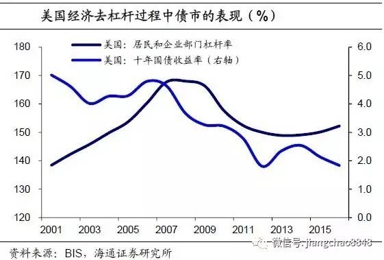 看外围:美日去杠杆利率长期下降。参考美国和日本的经验,经济去杠杆往往伴随着宏观基本面的回落和货币政策的再次宽松,债市迎来长期的投资机会。次贷危机后美国的居民和企业部门开始去杠杆,经济面临下行压力,货币政策持续宽松,十年国债收益率从4.8%下降到1.8%。而日本泡沫经济破裂后,为了去杠杆采取了量化宽松政策,十年国债收益率迅速下降到0附近。因此,随着我国经济去杠杆的推进,最终将伴随经济基本面的回落,带来债市新一轮的投资机会。