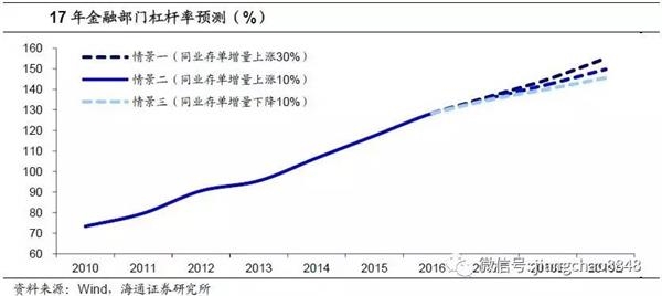 金融杠杆去化与否,同业存单成关键。金融去杠杆的效果主要看对同业存单增量的监管情况。我们按照同业存单增量在17年上涨30%、10%和-10%三种情景来推演,测算出金融部门杠杆率在17年分别上涨至136.6%、135.8%和134.9%。因此,能否抑制住同业存单的继续扩张将成为金融去杠杆的关键。