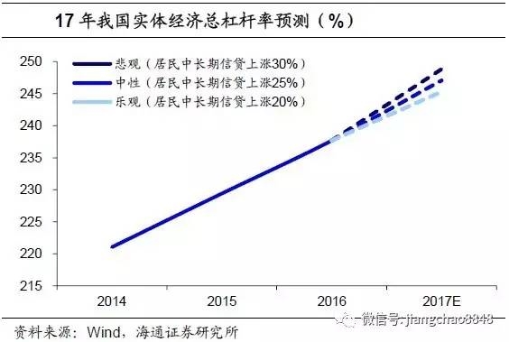 随后,我们按照政府、居民和非金融企业三部门的杠杆率加总来预测17年实体经济的杠杆率情况。根据上文中的计算结果,17年政府部门和非金融企业部门杠杆率预计达到45.5%和145%,而居民部门的杠杆率则要看房贷的增长情况,可按照居民房贷上涨30%、25%和20%三种情景来推测。最终,我们测算出悲观、中性和乐观情况下,17年我国实体经济的总杠杆率分别上升至249%、247%和245%。