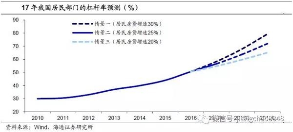 对于17年新增居民房贷的增幅,我们按照三种情景进行推演,情景一为居民房贷余额上涨30%、情景二为居民房贷余额上涨25%、情景三为居民房贷余额上涨20%。最终测算出2017年居民部门的杠杆率在三种情况下分别为58.3%、56.6%和54.8%。