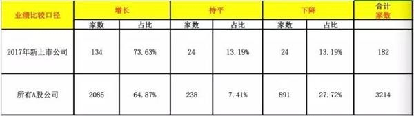 具体来说,今年以来,新上市公司业绩增长的公司有134家,占比73.63%;业绩持平的公司有24家,占比13.19%;业绩出现下滑公司24家,占比13.19%。而同期A股3214家上市公司的情况则是,一季度公司业绩增长的公司2085家,占比64.87%;业绩持平的公司有238家,占比7.41%;业绩出现下滑公司891家,占比27.72%.
