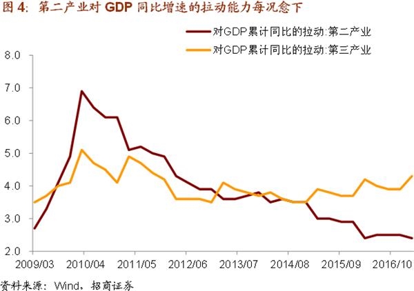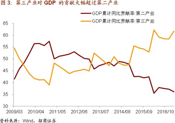1季度第三产业对GDP 的贡献率和拉动分别为61.7%和4.3%,远高于同期第二产业的36.1%和2.4%。并且,过去几年的数据显示,第三产业在国民经济的地位不断提升,而第二产业对整体经济的影响力不断衰弱。尽管过去一年以来,房地产投资形势较好,工业领域补库存力度较大,但是这并未改变第二产业滑落趋势。