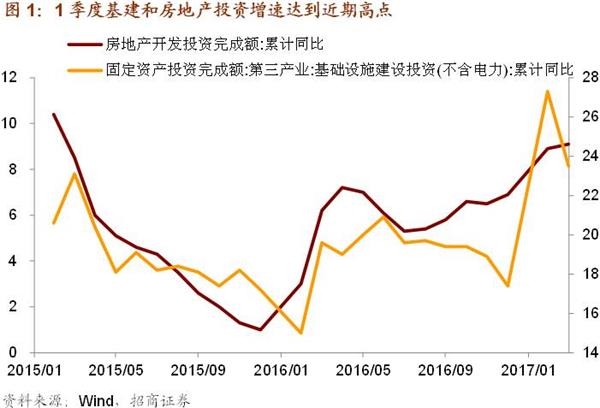 1季度国内经济数据明显超预期,突出体现在、投资和基建投资的同比增速上。1季度工业增速同比增长6.8%,较2016年全年回升0.8个百分点,其中3月工业增速为7.6%,达到两年来的最高水平。地产调控趋严对地产投资影响在1季度也不明显,前3个月投资同比增长9.1%,较2016年上涨2.2个百分点,也是过去两年来的最高水平。1季度基建投资增速也明显加快,1-3月基建投资同比增长23.5%,较2016年提升了6.1个百分点。