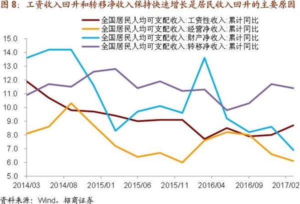 居民收入增速回升主要是两方面原因所致:第一,2016年以来工业企业盈利持续改善,使得居民工资性收入增速明显回升,1季度读数为8.7%,比2016年全年回升0.7个百分点,比去年同期高0.2个百分点。