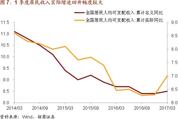 1季度居民收入情况明显好转,全国居民人均可支配收入名义和实际增速均有回升,其中收入实际增速为7.0%,较2016年回升0.7个百分点且跑赢同期经济增速0.1个百分点。
