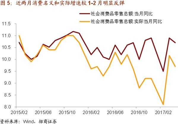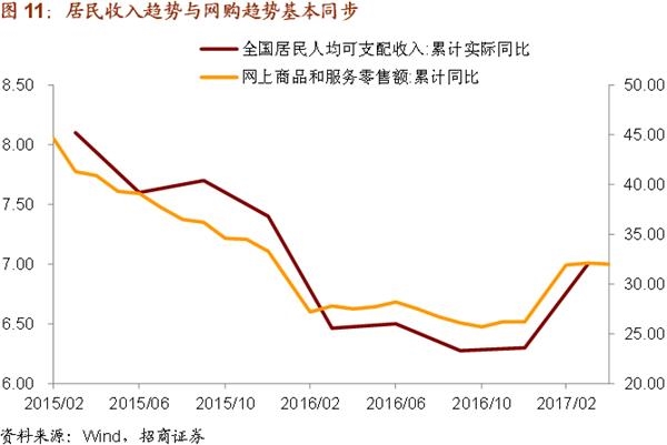 从1季度的情况看,尽管社会消费品零售额增速前两月和3月有较大差异,但是网购数据显示,居民收入与网购增速相关性非常明显。前4个月网购同比增长32.0%,较去年全年上升5.8个百分点,也明显高于去年同期水平,网购占比也回升至12.4%,达到2015年以来的第三高水平。