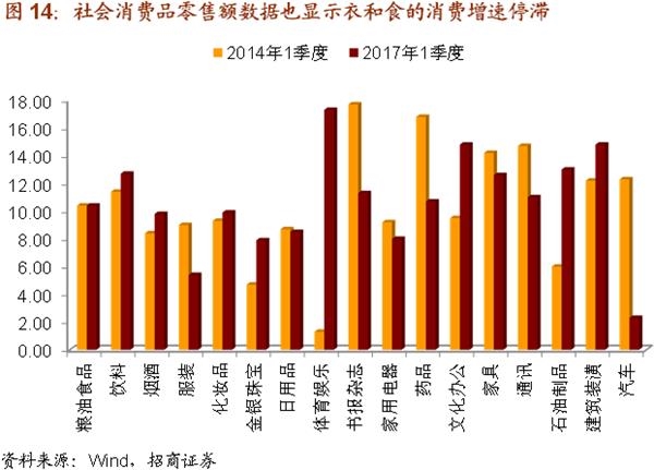 从社消数据看,今年1季度体育娱乐类零售额同比增速远高于2014年同期,1季度体育零售类商品零售额同比增长17.3%,居于各类商品之首。1季度文化办公类商品零售额也有明显增长,同比增长14.8%。服装类零售额同比增速明显回落,食品零售额同比增长停滞不前。另外,通讯设备类商品零售额增速也高于食品、烟酒以及服装类商品。