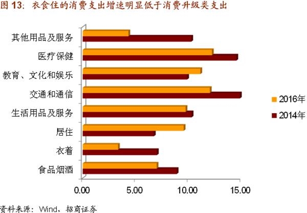 随着人均收入的提高,居民消费结构也在不断升级。从全国居民人均消费支出结构看,2014年到2016年间,食品烟酒和衣着的消费支出增速明显放缓,尤其是衣着消费支出增速由7%下降到3.3%,房价上涨导致居民居住支出上升了3个百分点左右,达到9.6%。