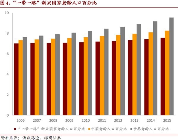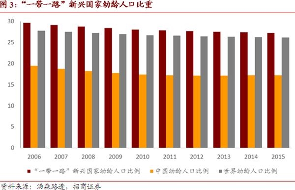 从人口结构看,“一带一路”国家较之中国来说,更加“年轻”。“一带一路”沿线新兴经济体(不包括中国)低龄人口(0-14岁)的比重为27%,比中国的17.2%高10个百分点;其老龄人口(65岁以上)的比重为7.6%,比中国的8.3%低0.7个百分点;其劳动人口(15-64岁)的比重为65.5%较中国的74.5%低10个百分点。