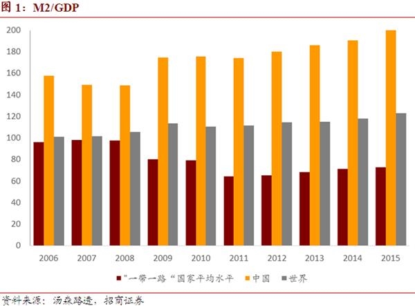 中国的杠杆率高,“一带一路”国家的杠杆率低。中国目前的M2与GDP之比为203%,“一带一路”国家仅为72.9%。