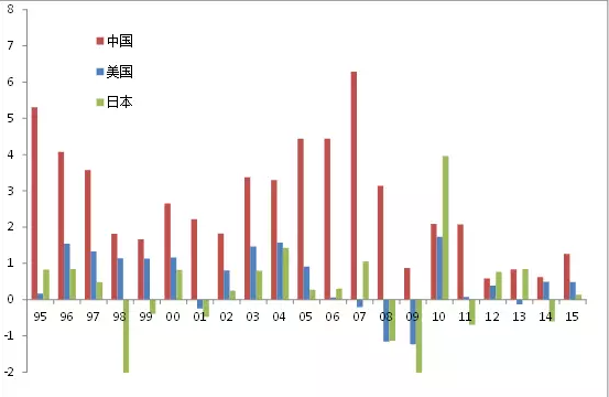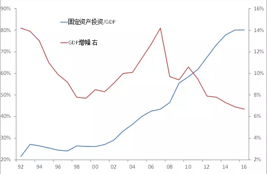 此外,由于资本投入和货币扩张的边际效应递减,在投资增速不变的情况下,经济增速要维持不降都很难,故从2011年至今我国GDP增速仍在缓慢下行中。虽然2016年中国固定资产投资近60万亿元,银行业总资产(大约等于信贷投放和买债规模)增加30多万亿元,都未能推动经济增速上行,可见增速下行的经济规律难以违抗。