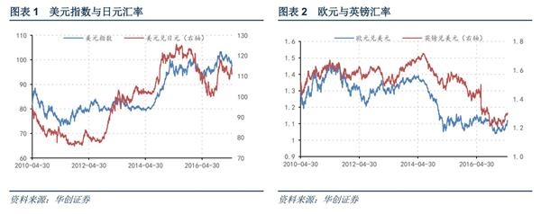 美元:美元指数下行,跌破强支撑区域。上周美元指数直线下行,并下破98.70强支撑区域,上周五收于97.11,环比下跌2.1%,创本年度单周最大跌幅。上周美元指数的疲软主要受特朗普泄密门事件的冲击,考虑到特朗普被弹劾的可能性近乎为0,特朗普时间对美元的压制有望消退,市场将重新聚焦欧美经济与货币政策的分化或收敛。根据5月18日公布的,上周初申请失业人数低于预期,暗示就业市场已接近美联储所指定的充分就业目标,但同时公布的其他经济数据均不及预期,加息预期略有下降。此外,5月18日美贸易代表称特朗普向国会发出重启北美贸易自由协定(NAFTA)谈判的通知,如果此次谈判成功,对美国工人、农民和企业将是一大利好。