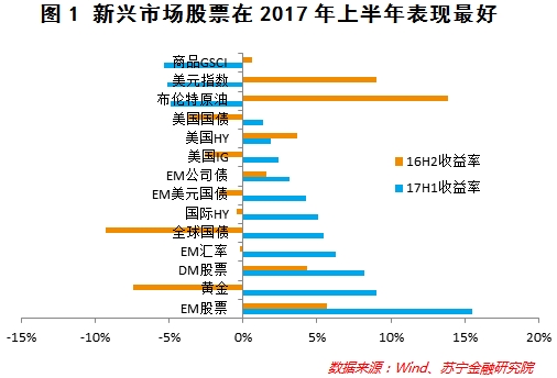 2017年上半年,表现最好的两类资产是新兴市场股票和黄金。从2016年底至5月19日,MSCI新兴市场指数和伦敦现货黄金价格分别上涨15%和9%(参见图1).