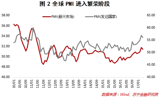 值得注意的是,今年上半年全球资本市场交易的核心逻辑是经济的反弹。不论是新兴市场还是发达国家,上半年延续了继续走高的态势,并且都处在50的荣枯分界线上方,意味着全球经济处在繁荣的阶段(参见图2)。经济的繁荣还叠加了市场对特朗普改革的美好预期,虽然特朗普的医改方案困难重重,但投资者对税改方案还是抱着极大的热情,毕竟税改方案如果获得实施对经济的刺激作用更大,美国增速有望重回3%的水平。