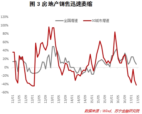 一是我国严厉的调控措施使得市场对投资增速的预期比较悲观,上半年房价环比涨幅已经大幅回落,70城市房价环比从去年9月的高点3.2%下滑至今年4月的0.6%,30大中城市的销量增速也从去年9月的30.7%下滑至今年4月的-41.9%(参见图3),意味着目前房地产进入量跌价平的阶段,如果保持目前的政策紧缩态势,后续房地产进入量价齐跌的概率较大,而房地产销售的下行肯定会影响市场对后续房地产投资增速的预期。