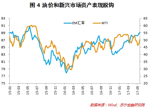 石油方面,一般石格走势和新兴市场资产走势在趋势上比较一致,但今年年初开始原油价格与新兴市场资产脱钩,新兴市场资产持续反弹,石油价格却在48至56美元之间窄幅波动(参见图4)。这说明,市场永远在波动之中,各类资产价格之间的关系也不断的发生变化,这可能就是投资这件事情有意思的地方吧!
