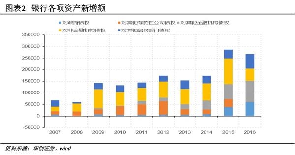借道大资管的新增信贷投放约12万亿。对非银债权的高增是银行资产与社融背离的另一个源头。刚性兑付下,为规避监管,银行借道非银实现对融资平台、地产和产能过剩行业的信贷投放,在金融资产负债表上就表现为对非银债权的膨胀。截止2016年12月,对非银债权余额26.53万亿,较14年新增15.38万亿,此外表外理财新增13万亿;同期大资管(基金子公司、券商资管和信托)新增19.39万亿,其中非标新增约12万亿。