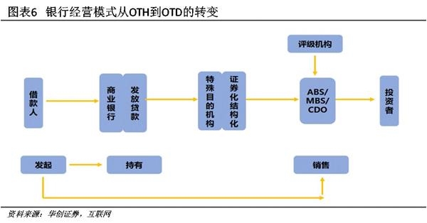 金融“空转”本质是金融机构对次级债务采用了“originate-to-distribute”模式(对于合规信贷则采用buy-and-hold模式),在多重嵌套中实现风险分担和缓释。上世纪80年代利率市场化进程倒逼美国银行业加快金融创新、发展以资产证券化为主的表外业务,经营模式也由OTH向OTD转变。传统的OTH贷款经营模式下,银行承担期限错配、流动性风险和信用风险于一身,而在OTD模式下,银行将次级贷款等资产借道特殊目的机构(SPV)实现出表,以结构性金融产品的形式把收益和风险转移给投资者。