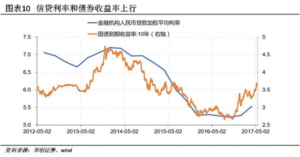 实体融资视角:融资成本回升、表外融资收缩。2017年年初以来,10年期国债收益率上行52BP,由于利率过高而取消或推迟发债的规模高达3050亿,信托、委托贷款在一季度的狂欢过后也在4月急剧收缩;表内信贷方面,一季度票据融资加权平均利率上行87BP,一般贷款仅上行19BP,但随着资金成本的不断上扬,预计在二季度也将加速上行,微观调研显示多家银行正在上调FTP价格。