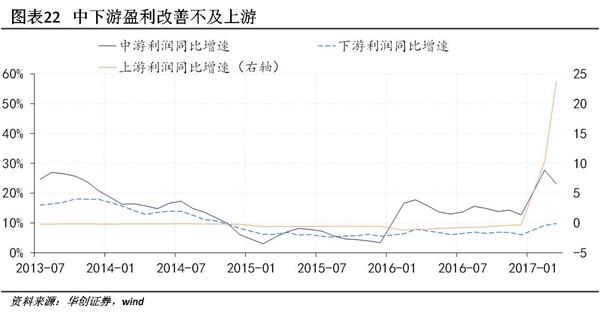 信用风险可能更多来自定价能力不足的中下游领域。当然,与2014年不同的是,转正具有重要的金融含义,工业企业盈利和政府都同步明显改善,上市公司财务数据也显示企业偿债能力正在提高,大规模信用风险爆发的可能性显著下降。但进一步拆分结构,中下游企业盈利受到成本挤压改善有限,信用事件的发生可能更多来自定价能力不足的中下游领域。