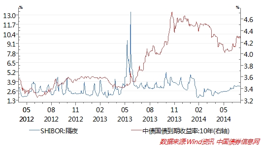 从数据来看,“钱荒”时期银行同业隔夜拆放利率(SHIBOR)于2013 年 6 月20日达到13.44%的历史峰值,此后虽然快速回落,但整体利率水平仍大幅高于此前的数年均值水平。短端利率攀升带动中长期利率走高,10年期国债收益率从2013 年7月初的3.5%左右,持续攀升至当年末的4.72%,并持续保持在高位水平(参见下图)。与此同时,代表实体经济融资成本的金融机构人民币贷款加权平均利率也从2013年3月末的6.65%上升到12月末的7.2%。