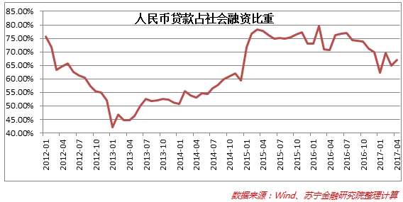 金融去杠杆对社会融资的影响不仅体现在规模上,还将对社会融资结构产生显著影响。2013-2014年金融去杠杆过程中,商业银行表内贷款业务在社会融资中的地位显著上升,2013年1月至2015年3月,人民币贷款规模占社会融资的比重由42.1%上升到78.3%。在此之后的2015年和2016年,各种监管套利、金融创新、影子银行再度泛滥,加上净息差的收窄,商业银行表内贷款业务占社会融资比重也下降到2017年1月的62.1%。近两个月,决策部门的强力监管举措实施后,人民币占社会融资的比重4月份已上升到78%,人民币表内贷款业务重新成为社会融资的主体,预计这一趋势将得到延续。