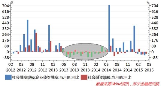 2013年钱荒和金融去杠杆,使得社会融资规模出现了快速萎缩。2013年6月至2015年5月的累计24个月内,新增社会融资规模同比负增长的月份达到17个月,正增长月份仅为4个月,而在2013年6月前的12个月内,月度社会融资规模同比全部实现了正增长。其中,社会融资中的企业债券融资受市场利率均值水平上移的影响最为直接——2013年6月至2014年3月,企业债券融资连续10个月同比大幅负增长,成为拖累社会融资总规模萎缩的重要因素。