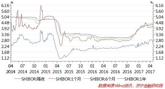 把视线拉回到当前正在进行的金融去杠杆,本轮货币政策微幅收紧启动于2016年12月。与2013年钱荒相比,今年以来虽然资金市场频频曝出银行同业拆借违约事件,但全局性钱荒并未发生,市场利率波动也更为平缓,没有发生大起大落的情况。从不同期限利率看,银行同业隔夜拆放利率(SHIBOR)由年初的2.11%上升到5月4月的2.8506%阶段性高点,随后稳步回落。1月、6月和1年期SHIBOR利率都于3月下旬达到高点,随后开始双向波动(参见下图).