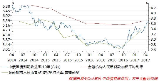 综上,虽然货币政策紧平衡和金融去杠杆与 2013 年“钱荒”有诸多相似之处,但并非完全简单的重复,最大的区别在于“钱荒”时期利率调整和金融去杠杆的进程要更为剧烈。换言之,本轮金融去杠杆可能要比 2013年经历更长的时间。截止目前,短端利率已经停止上升,但10年期国债收益率上升趋势还在持续,实体经济融资成本(金融机构贷款加权利率)的回升才刚刚起步。