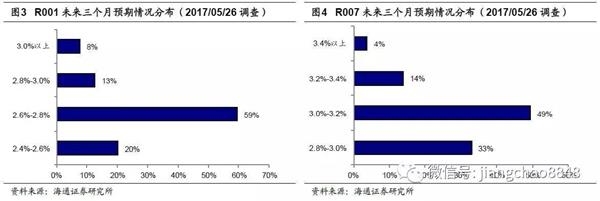 对于R007,目前利率中枢为2.98%。49%的受访者认为R007将在3.0%-3.2%之间波动;33%的受访者认为R007会小幅回落至2.8%-3.0%;也有14%的受访者认为R007会小幅抬升至3.2%-3.4%。