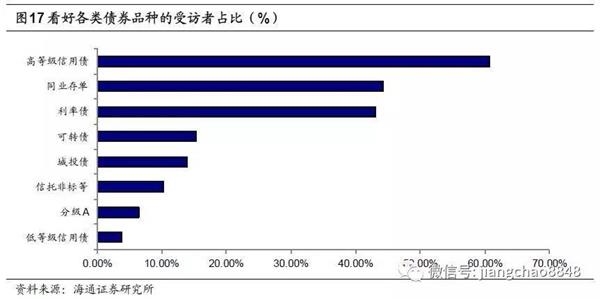 对于最看好的债券品种,有超过60%的受访者选择看好高等级信用债,超过所有其他品种,目前高等级中票短融收益率已经大幅超过同期限贷款基准利率,信用利差水平也已经回升至历史中高水平,多数受访者认为已经具备投资价值。
