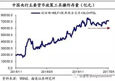 那么央行究竟有没有缩表呢?正常情况下,如果经济在增长,那么需要的货币量也是增加的,所以央行要么增加基础货币供给,要么降准提高货币乘数。在当前法定存款准备金率保持不变的情况下,即使央行的基础货币走平或者维持低增长,央行也是在变相缩表的,因为货币的需求量在增加。从近期央行的货币政策操作来看,年初至今逆回购、MLF、PSL等操作存量基本是走平的,增速相比去年大幅下降,这至少说明了央行在主动控制资产负债表的增长。
