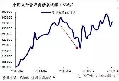 所以在2016年央行的资产负债表是扩张的,但是进入2017年后情况又发生了变化。首先是2、3月份央行资产负债表规模下降了近1万亿,而外汇占款的降幅却很小,似乎央行在主动缩表,但是央行在一季度货币政策报告中指出这主要是季节性因素导致的。