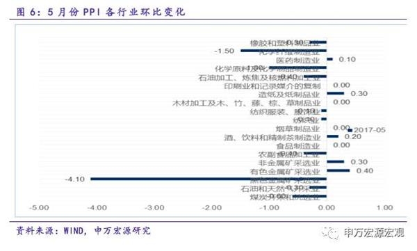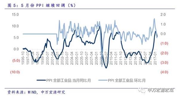 PPI同比涨幅中翘尾因素为主,同比下降主要受生产资料价格回落拖累。5月PPI同比上涨5.5%,较上月回落0.9个百分点。其中生产资料价格同比上涨7.3%,较上月下降1.1个百分点,拖累总PPI水平0.83个百分点;生活资料价格同比上涨0.6%,较上月下降0.1个百分点,拖累总PPI 0.025个百分点。其中,煤炭开采和洗选业、石油和天然气开采业价格、石油加工业、黑色金属冶炼和压延加工业、有色金属冶炼和压延加工业、化学原料和化学制品制造业同比涨幅分别较上月回落3.2、16.0、5.5、4.6、2.2、1.5个百分点。5月同比涨幅中大部分来自去年的翘尾因素,5月去年价格翘尾因素约为4.5个百分点,占总涨幅的82%;新涨价因素约为1.0个百分点,仅占18%。
