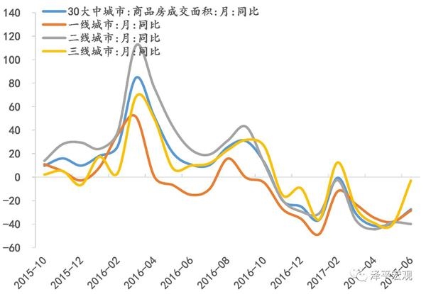 图表1:6月30大中城市地产销售降幅继续缩窄