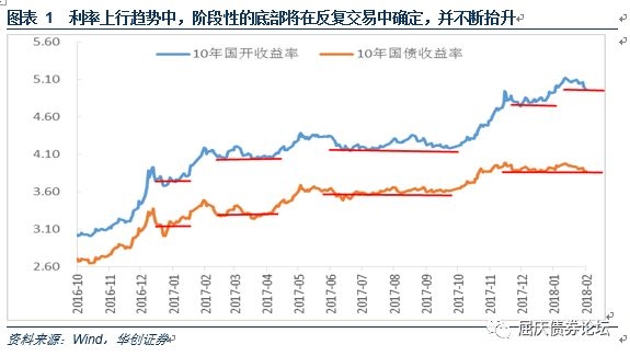 回顾16年10月以来利率的上行趋势,可以看到利率也并不是一直处于上行之中,中间也会有短期的下行修复,反复筑底之后再次上行,而且筑底的时间长端也不一样。比如16年底,利率经过快速大幅上行后出现较明显的回落,不到一个月的时间再次上行;再比如17年7月至9月,10年国债在3.6%、10年国开4.2%附近震荡筑底,时间长达3个月,10月开始大幅上行。
