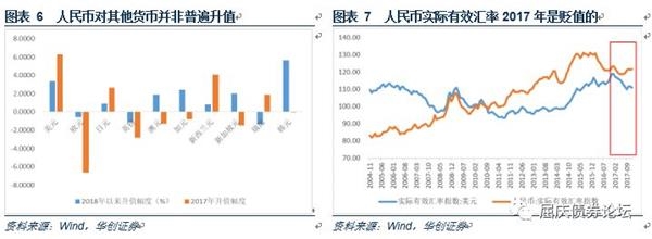 首先,此前人民币升值并非是普遍的。从人民币兑各国货币的涨跌幅来看,2017年,虽然人民币兑美元大幅升值,但是兑欧元、英镑、澳大利亚元、加拿大元、新加坡元以及韩元均是贬值的,贬值幅度分别为:6.63%、2.81%、1.3%、0.82%、1.5%、0.04%。除了兑美元升值之外,只有对日元、新西兰元和瑞郎是升值的。进入2018年以来,随着美元的持续大幅走弱,导致人民币快速升值。因此可以看出,人民币兑非美货币并非普遍升值,意味着人民币的本轮强劲升值的主要推手是美元走弱。其次,人民币大幅升值并没有使得居民结汇意愿一致走强,一致升值预期并没有形成。从外汇占款看出,2017年以来人民币大幅升值的过程中,并没有带来资本的流入,外汇占款流入并没有增多,这也能够证明虽然人民币在持续升值,但是居民结汇意愿依然不是特别强烈,并没有形成一致的升值预期。最后,从人民币实际汇率有效指数中也可以看出,虽然2017年以来人民币兑美元大幅升值,但是实际人民币汇率指数仍低于2017年初,人民币依旧偏弱。